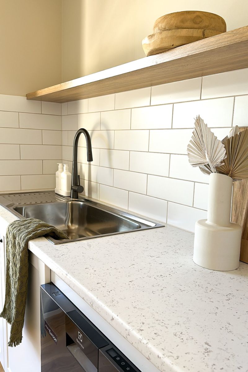 Selecting neutral colours, like whites and greys, is a timeless option. This allows the addition of a colourful feature piece, whether that be through the tapware, splashback, styling pieces or all three.
